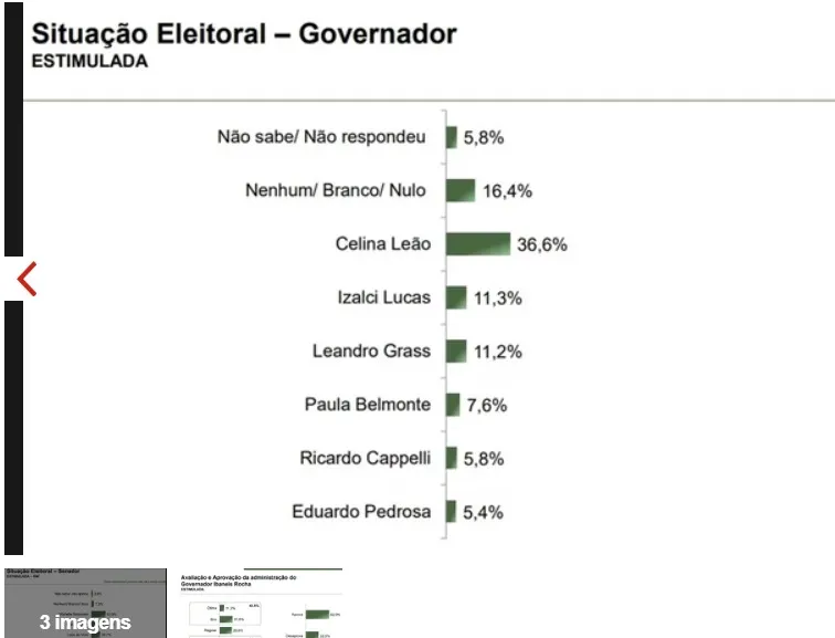 Celina Leão tem 36,6% das intenções de voto. Ainda entre possíveis candidatos a governador, o senador Izalci Lucas (PL) fica com 11,3%, e o presidente do Instituto do Patrimônio Histórico e Artístico Nacional (Iphan) Leandro Grass (PV) 11,2%.