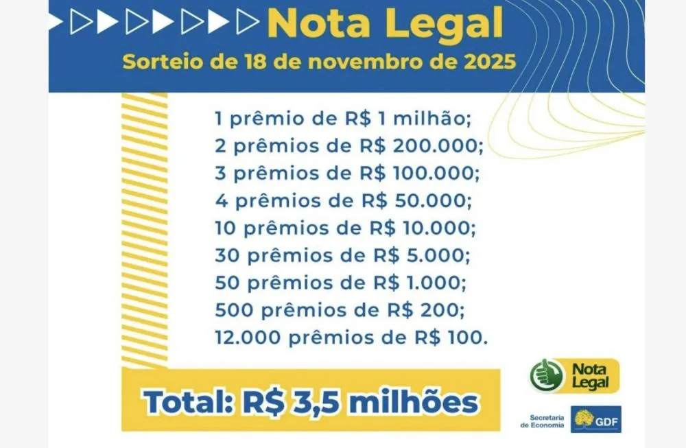 Atenção, consumidores! O segundo sorteio de 2025 do Programa Nota Legal vai acontecer na próxima terça-feira (18/11). Ao todo, serão distribuídos R$ 3,5 milhões em prêmios, com destaque para o principal valor de R$ 1 milhão, livre de impostos. Os vencedores serão avisados por e-mail, mas também podem consultar os resultados na área restrita do portal Nota Legal.