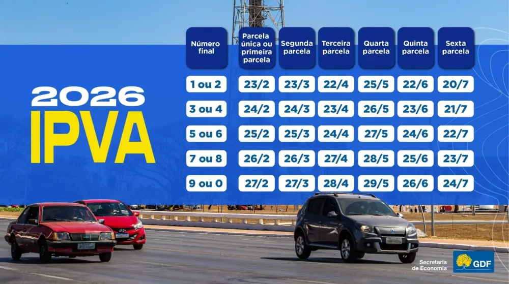 Os primeiros vencimentos do IPVA no DF começam a partir da segunda-feira (23/2), conforme o final da placa, e seguem até sexta-feira. O tributo pode ser pago em cota única, com 10% de desconto, ou parcelado em até seis vezes iguais — desde que cada parcela não seja inferior a R$ 50. Os boletos foram enviados pelos Correios. Quem não recebeu, deve consultar segunda via no portal receita.fazenda.df.gov.br, na aba Emitir o IPVA. O aumento médio é de 1,72% em relação ao ano passado e as alíquotas são de 1%, 2% e 3%, conforme o tipo de veículo. Neste ano, o GDF prevê arrecadar R$ 2,14 bilhões com o imposto.