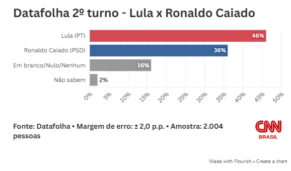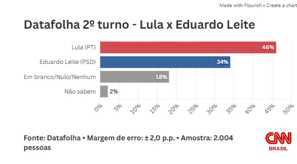 Lula aparece na frente em todos os cenários de primeiro e segundo turnos testados, mas a vantagem está em queda. A pesquisa aponta que no cenário hoje mais provável para o primeiro turno, Lula tem 38% contra 32% de Flávio.