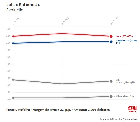 Na simulação estimulada de segundo turno, Lula registra 46%, ante 43% de Flávio Bolsonaro, o que representa um empate técnico. Em dezembro do ano passado, o petista registrava 51% e Flávio, 36%.