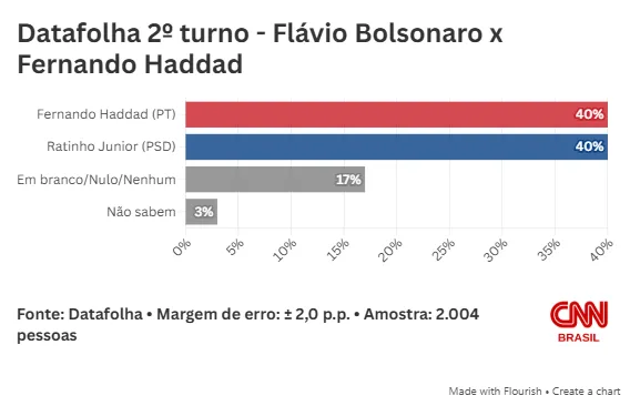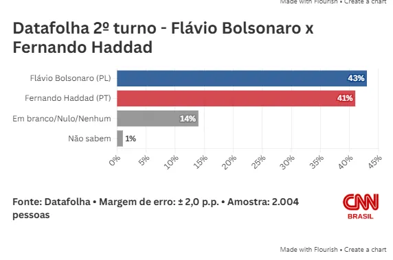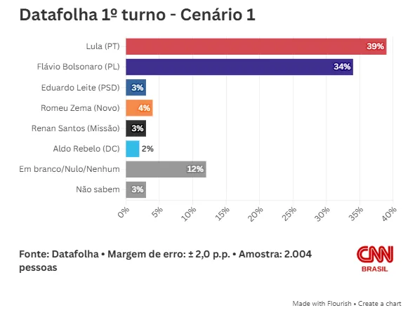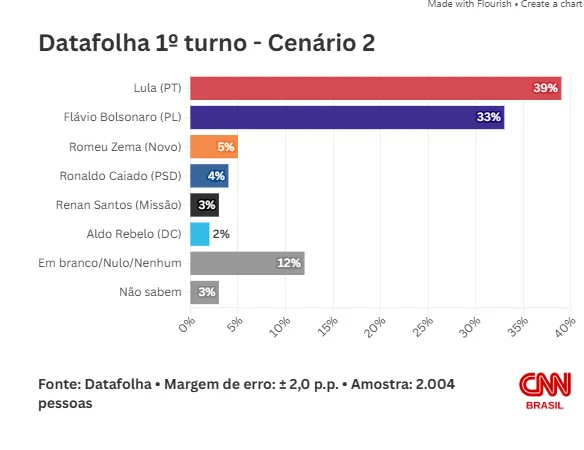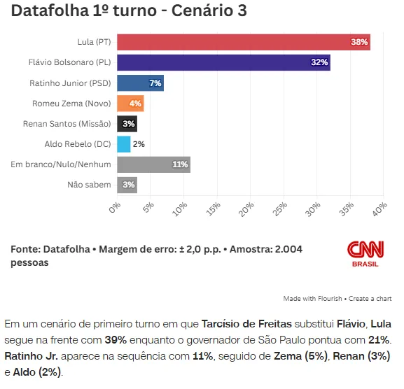 O senador Flávio Bolsonaro (PL-RJ) se aproxima do presidente Lula (PT) no primeiro turno e empata, tecnicamente, com o petista no segundo turno. É o que mostra pesquisa Datafolha divulgada neste sábado (7).