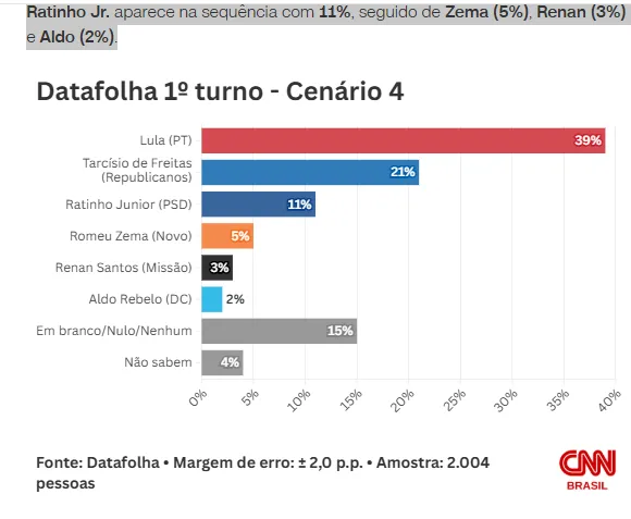 Ratinho Jr. (PSD) aparece na sequência com 7% e o governador de Minas Gerais, Romeu Zema (Novo), com 4%. Já Renan Santos (Missão, 3%) e Aldo Rebelo (DC, 2%). Rejeitam todos os candidatos 11%, e 3% dizem não saber em quem votar.