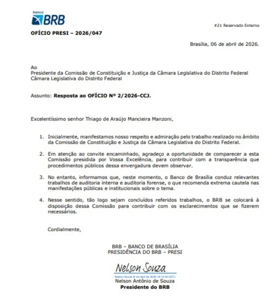 “Neste momento, o BRB conduz relevantes trabalhos de auditoria interna e auditoria forense, o que recomenda extrema cautela nas manifestações públicas e institucionais sobre o tema”, disse.