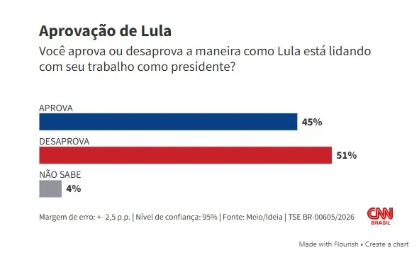O presidente Luiz Inácio Lula da Silva (PT) é desaprovado por 51% dos brasileiros, enquanto 45% aprovam o trabalho do petista. Os dados são da pesquisa Meio/Ideia, divulgada nesta quarta-feira (8).