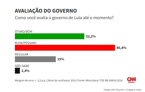A pesquisa ainda analisou a avaliação do governo. Para 46,4% dos eleitores, a gestão de Lula é considerada como "ruim" ou "péssima", enquanto 32,2% afirmam que o governo é "ótimo" ou "bom". São 19% os que avaliam como "regular" e outros 2,4% não sabem.